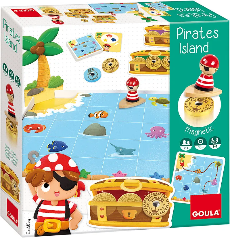 Segeln Sie entlang der Route zur Insel und finden Sie Goldmünzen. Spielplan, 1 Pirat (mit Magnet), 10 Holzstücke, 4 Truhen und 20 Karten. Arrarrarr! Bei diesem Spiel von Goua sind kleine Piratinnen und Piraten gefragt. Mit dem Boot geht es auf große Schatzsuch...