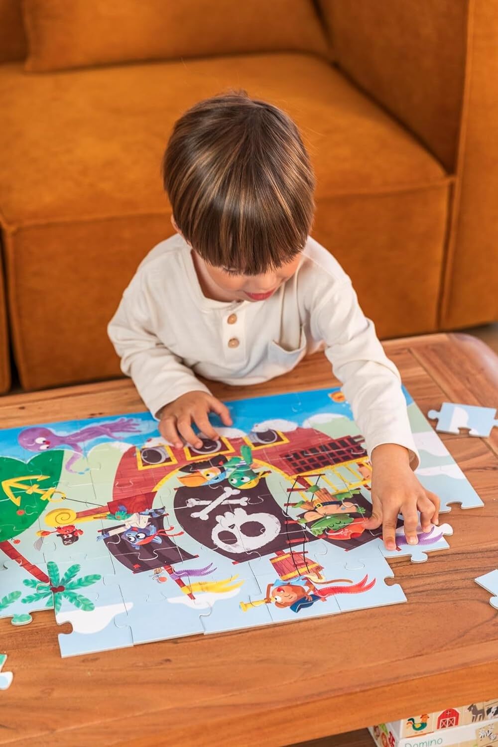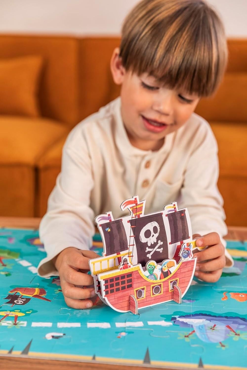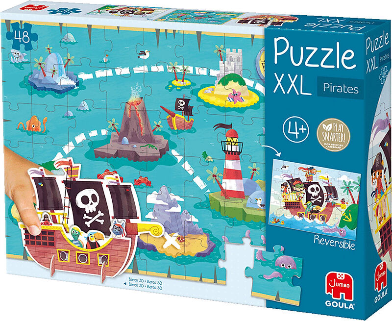 Incl. Piratenschiff zum nachspielen Doppelseitiges XXL-Puzzle mit zwei verschiedenen Motiven. Das Puzzle ist aus stabilem Karton gefertigt, was das Puzzeln erleichtert. Großes Puzzle mit XXL-Teilen zum Thema Piraten. Mit einer lustigen Illustration auf der Vor...