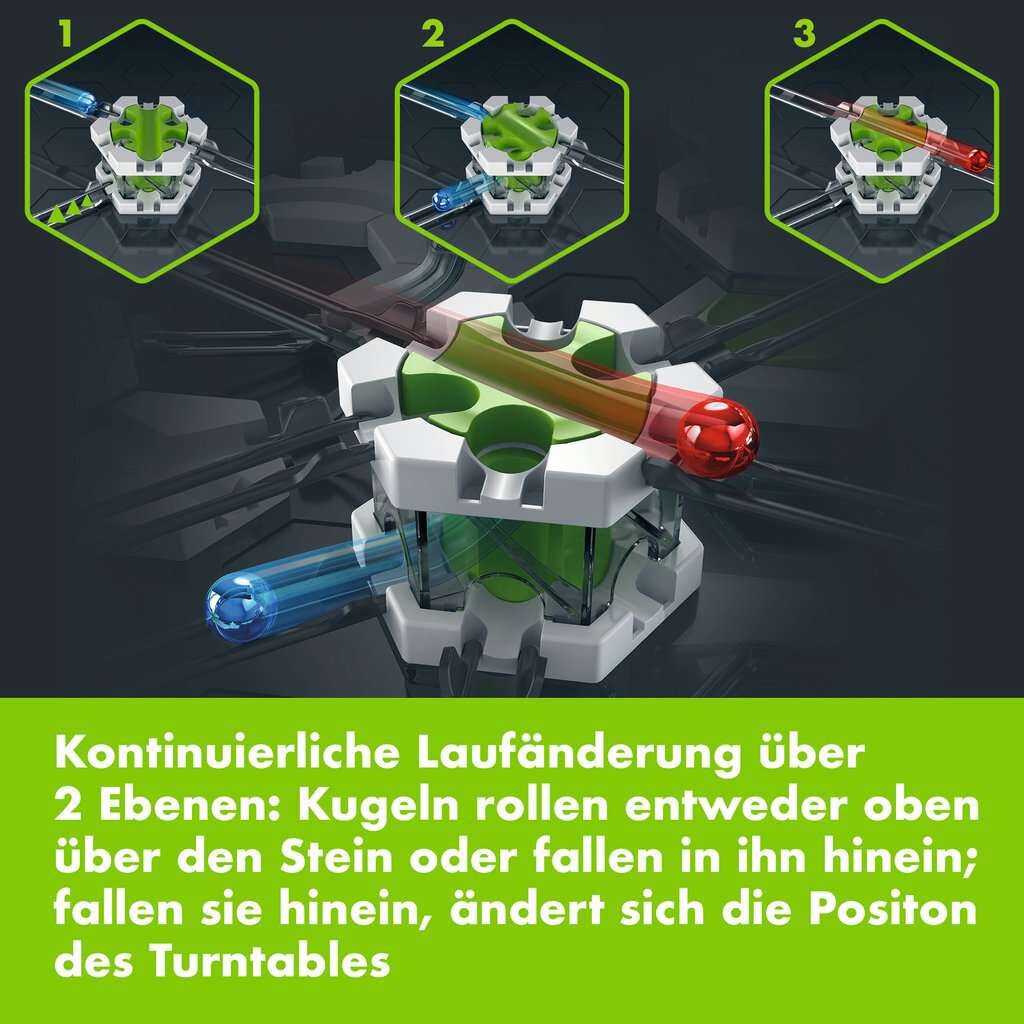 Mehr Kontrolle über die Wege der Kugel! Beim PRO Turntable lassen passierende Kugeln eine mechanische Drehscheibe rotieren. Indem eine Kugel durch den Stein nach unten rollt, verändert sie ihre Richtung und stellt zugleich die Drehscheibe um. Dies ermöglicht m...
