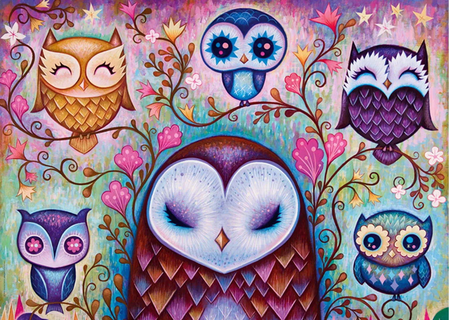 Jeremiah Ketner schafft es mit seinem feinen, kunstfertigen Malstil, aus trendigen Eulen ein ganz besonders gelungenes und liebenswertes Grüppchen zu gestalten. Gelegte Grösse: 70x50 cm.
