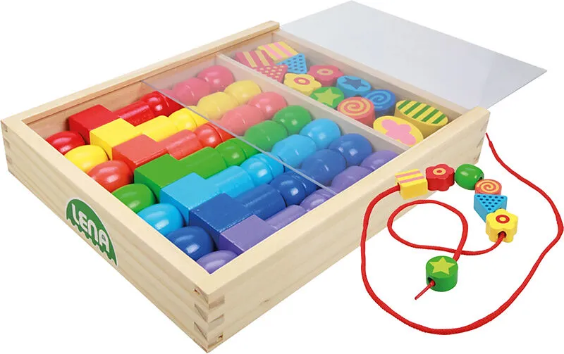 Große Holzfädelperlen LENA® Super Beads Holzfädelperlen, bestehend aus 54 großen Holz-perlen mit einer Größe von 3 cm in 10 Formen und 7 Farben sowie bunten Fädelkordeln. Geeignet für Kinder ab 3 Jahren. Verpackt in wiederverschließbarer Holzkassette mit Produ...