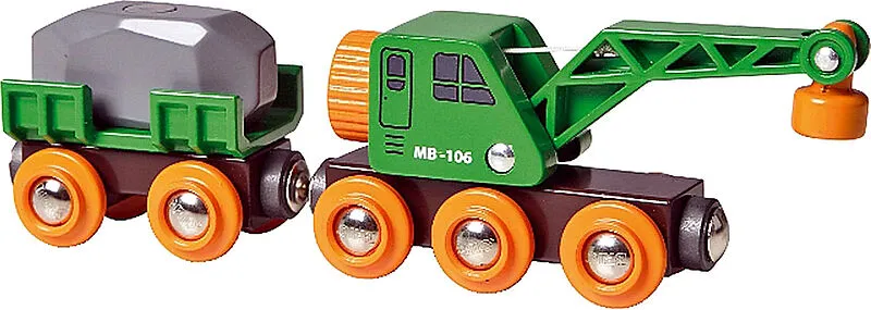 Anheben, drehen und absetzen. Egal welche Güter der Kranwagen erledigt die Arbeit spielend. Nach rechts oder links, rauf oder runter dreh an der Kurbel und hol die Ladung vom Wagen. Lässt sich mit der BRIO Bahn kombinieren. Anheben, drehen und absetzen. Egal w...