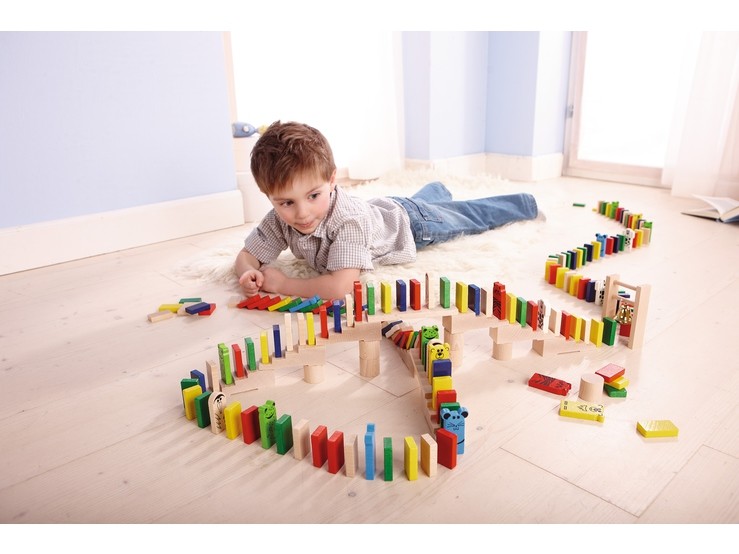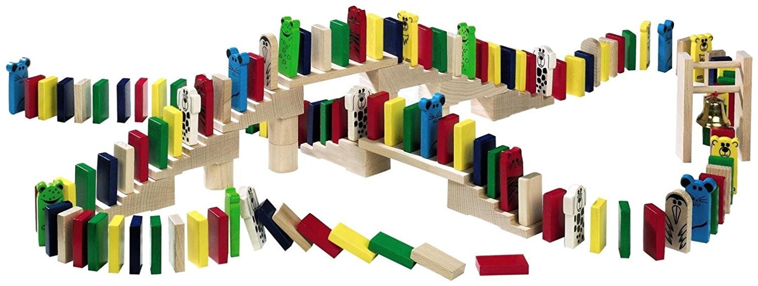 Mit den insgesamt 263 naturbelassenen und farbenfrohen Steinen aus schönem Buchenholz lässt sich eine scheinbar endlos lange bunte Bauklötzchen-Kette bilden. Es geht treppauf, treppab und durch ein Glöckchen-Tor. Fällt ein Klötzchen, fallen dank Domino-Effekt ...