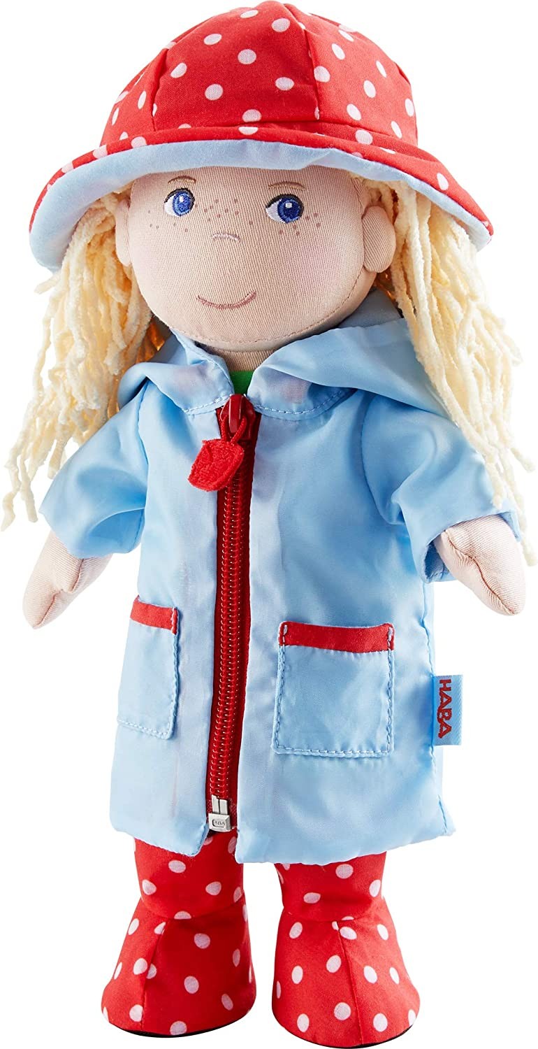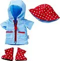 Das farbenfrohe Kleiderset Regenzeit von HABA sorgt auch bei Regen für gute Laune. Es besteht aus einem hellblauen Regenmantel mit Kapuze und zwei Taschen sowie einem Regenhut und Regenstiefeln in Rot mit weißen Punkten. Dank Reißverschluss lässt es sich kinde...
