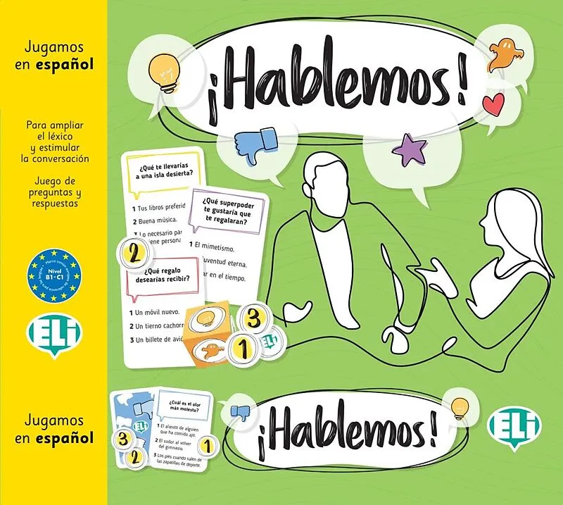 ¡Hablemos! ist ein unterhaltsames Spiel, das den Wortschatz bereichert und die Konversation anregt. Das Ziel ist die Verbesserung der Ausdrucksfähigkeit und der mündlichen Interaktionsfähigkeiten der Teilnehmerinnen und Teilnehmer. Die Fragen und Antworten wu...