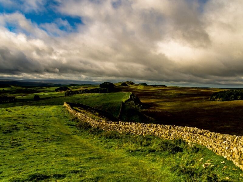 Hadrians Wall in England mit Sonnenstrahlen zwischen Wolken