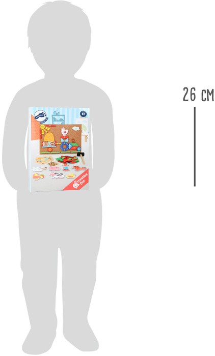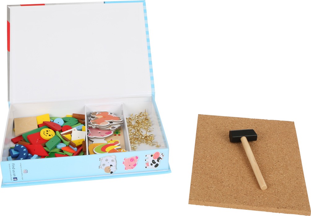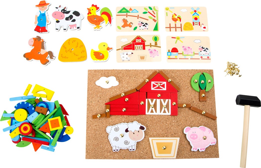 Mit diesem Hämmerchenspiel lassen sich verschiedene Bauernhofmotive auf ein Korkbrett hämmern. Vier Karten zeigen Motivvorschläge, wie ein Bild aussehen kann. Verpackt in einer Schachtel ist es gut aufzubewahren. Maße: Korkplatte ca. 24 x 17 x 1 cm, Hammer ca....