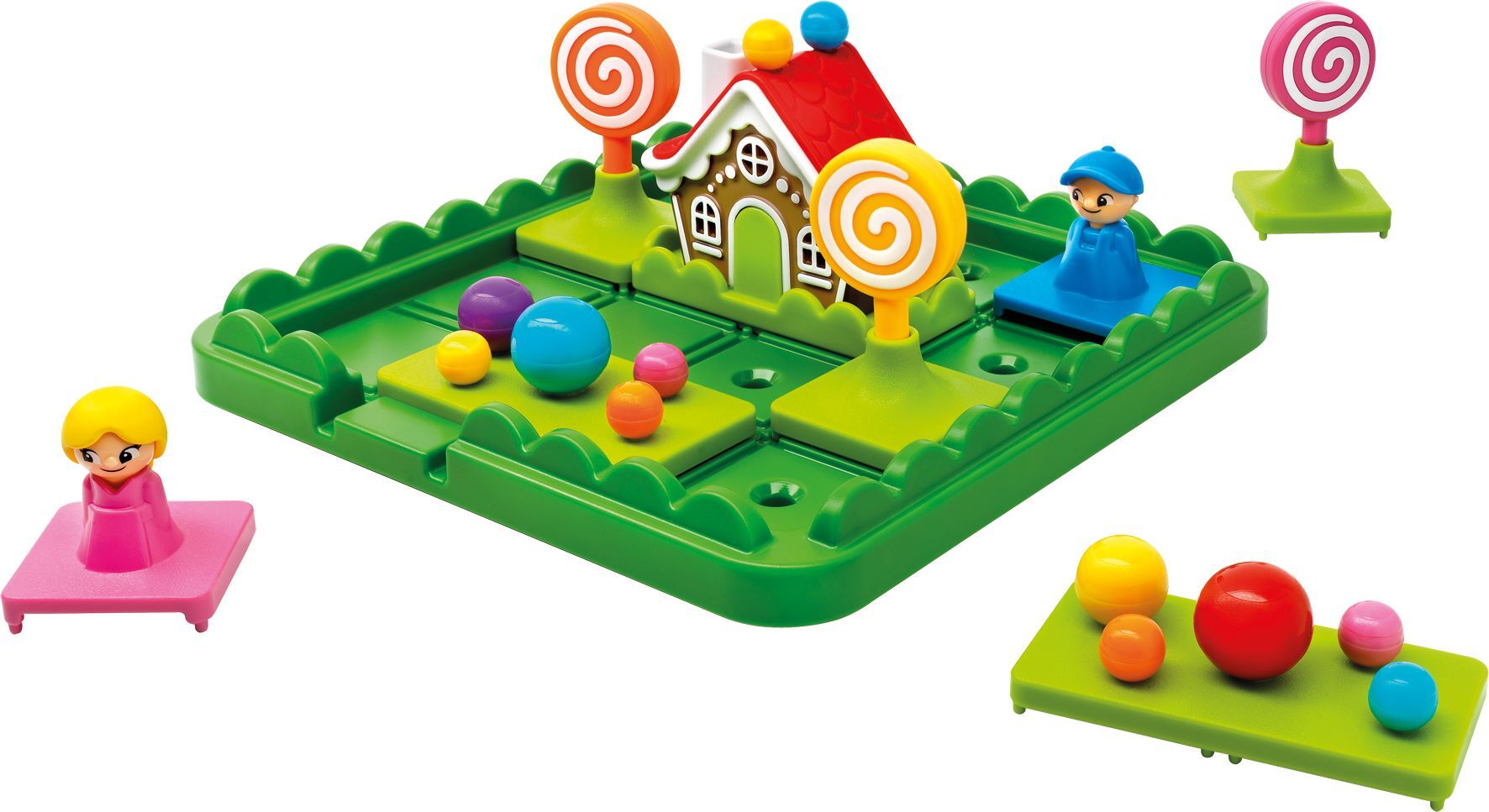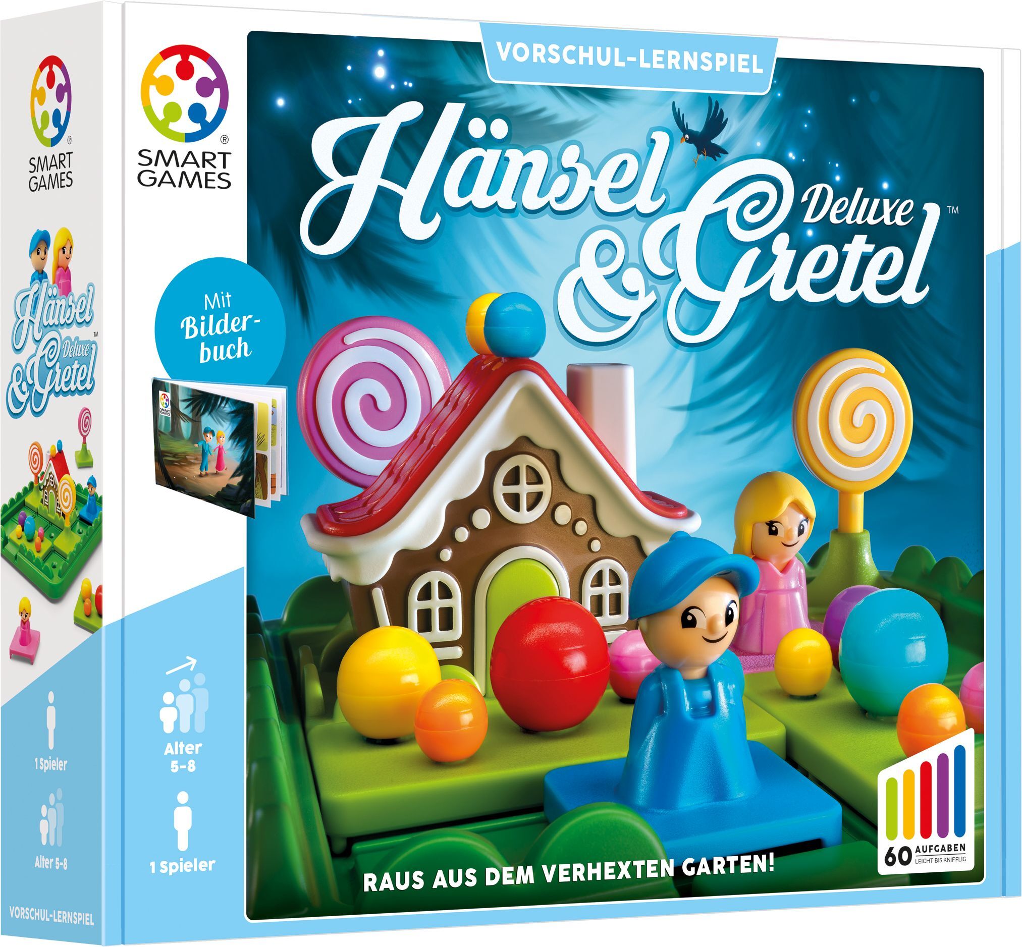 Hänsel + Gretel müssen aus den Bonbonsgarten geführt werden. Alle Spielfiguren und Elemente können verschoben werden um dies zu Erreichen. Inklusive Bilderbuch für die Kleinen.