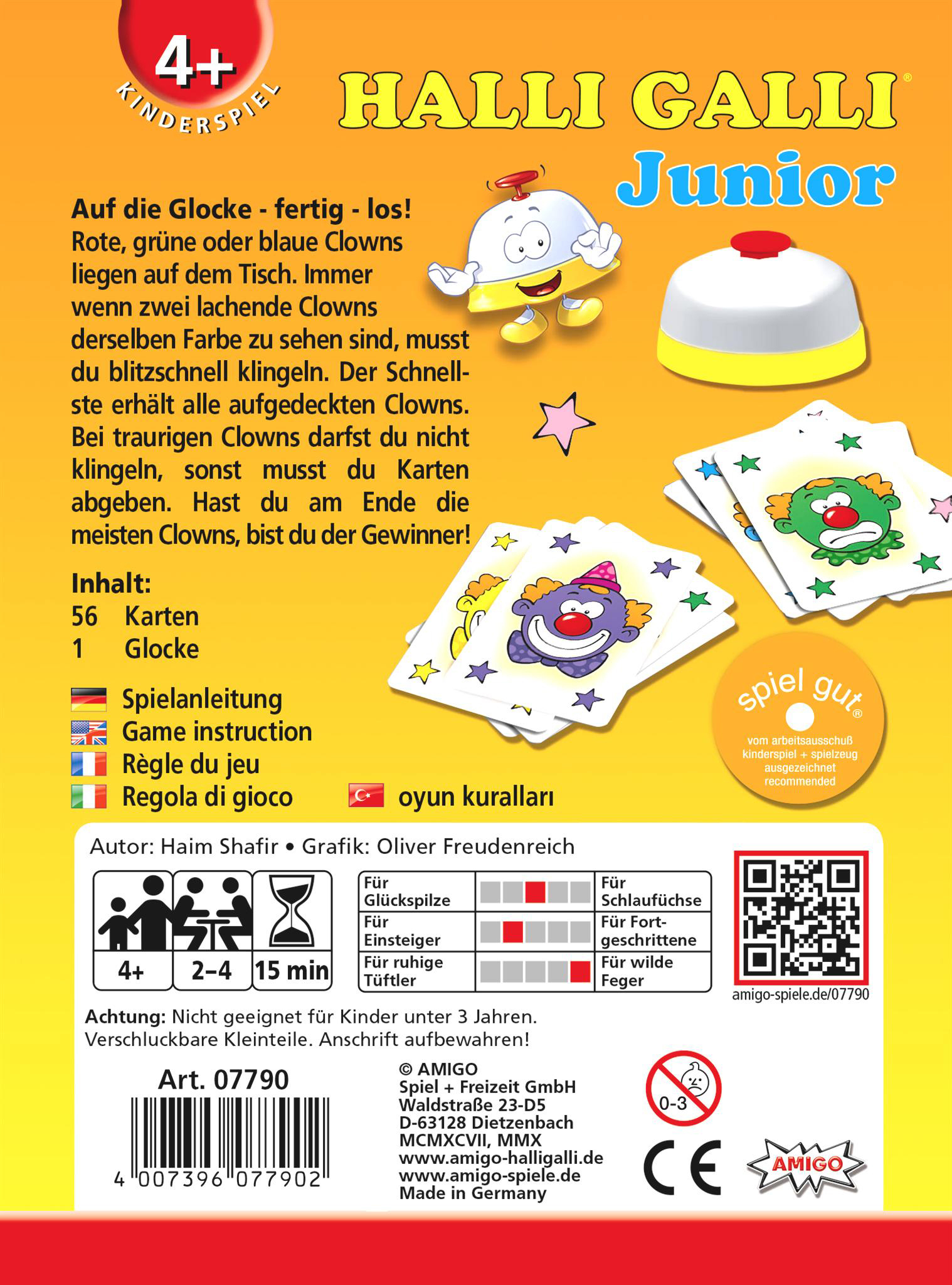 Halli Galli Junior Halli Galli Junior MBE3 Wie schon beim furiosen Dauerbestseller Halli Galli geht es auch in der Junior-Variante konzentriert und blitzschnell zur Sache. Sobald zwei gleichfarbige Clowns zu sehen sind, gibt es kein Halten mehr und alle Hände ...