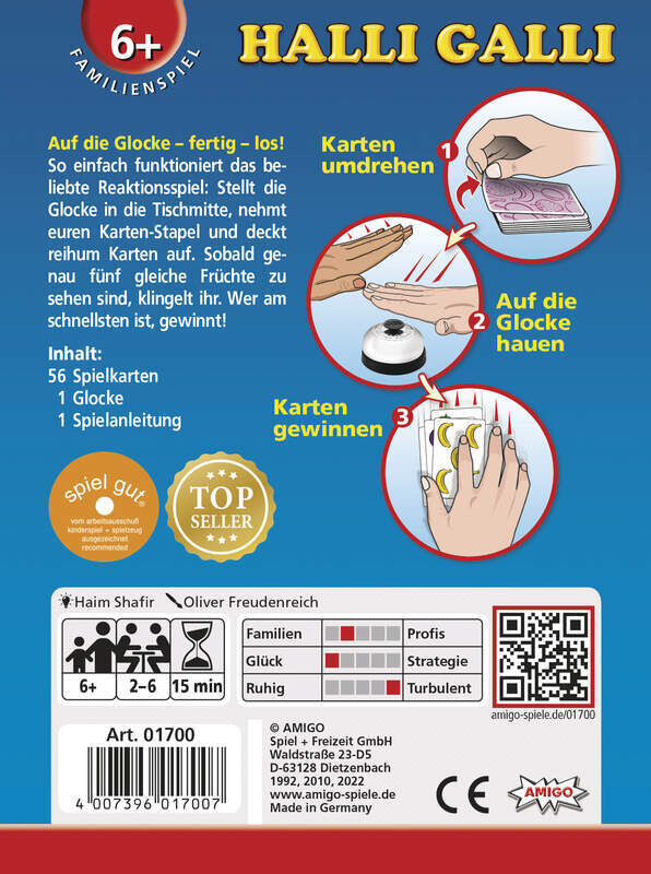 Halli Galli Halli Galli MBE3 Auf die Glocke - fertig - los! Da haben wir den Salat! Ein großer Fruchtcocktail mit Bananen, Erdbeeren, Limonen und Pflaumen - das ist Halli Galli. Schnelligkeit und ein gutes Auge sind hier Trumpf. Sobald die Spielenden fünf glei...