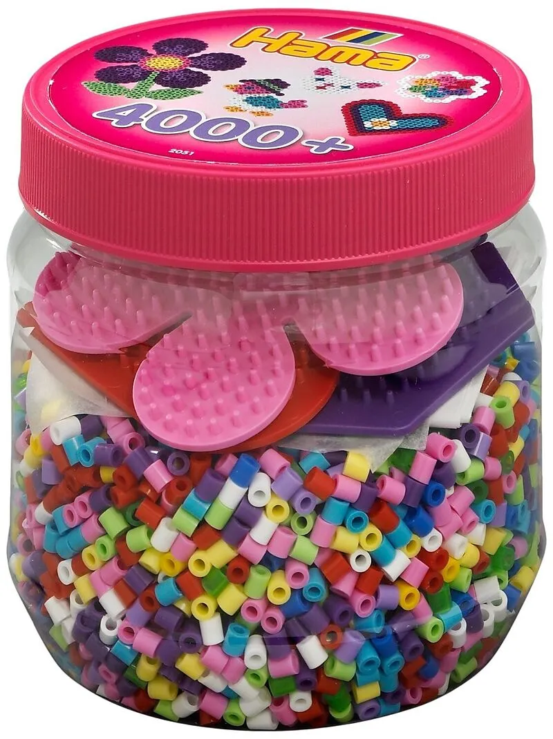 HAMA Bügelperlen Dose mit 4.000 Perlen und den Stiftplatten kleines Sechseck, kleines Herz und kleine Blume. Ab 5 Jahren.