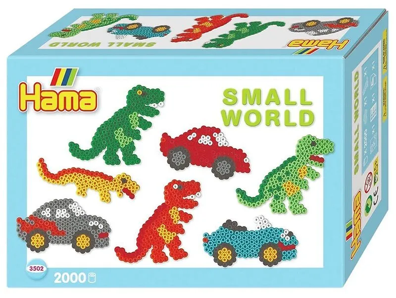HAMA Geschenkpackung ''Kleine Welt'' enthält ca. 2000 Bügelperlen, die Stiftplatten Auto und Dinosaurier, Motivvorlage, Anleitung und Bügelpapier. Ab 5 Jahren.
