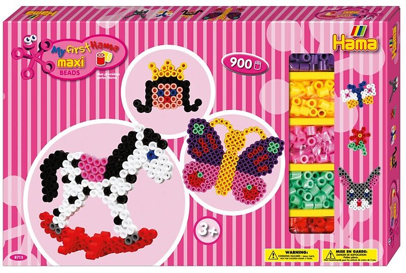 Geschenkpackung Maxi enthält ca. 900 Maxi-Perlen, die Stiftplatten Schmetterling und Schaukelpferd, Motiv-Vorlagen, Anleitung und Bügelpapier, sowie 2 Motivstützen. Ab 3 Jahren.
