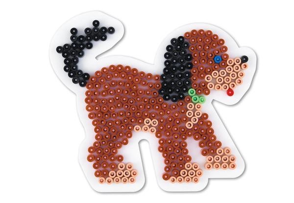 Stiftplatte von Hama für das Stecken von Bügelperlen mit Hunde-Motiv. Die Legeplatte kann nach dem Bügeln wieder verwendet werden. Maße: 13 x 11 cm.