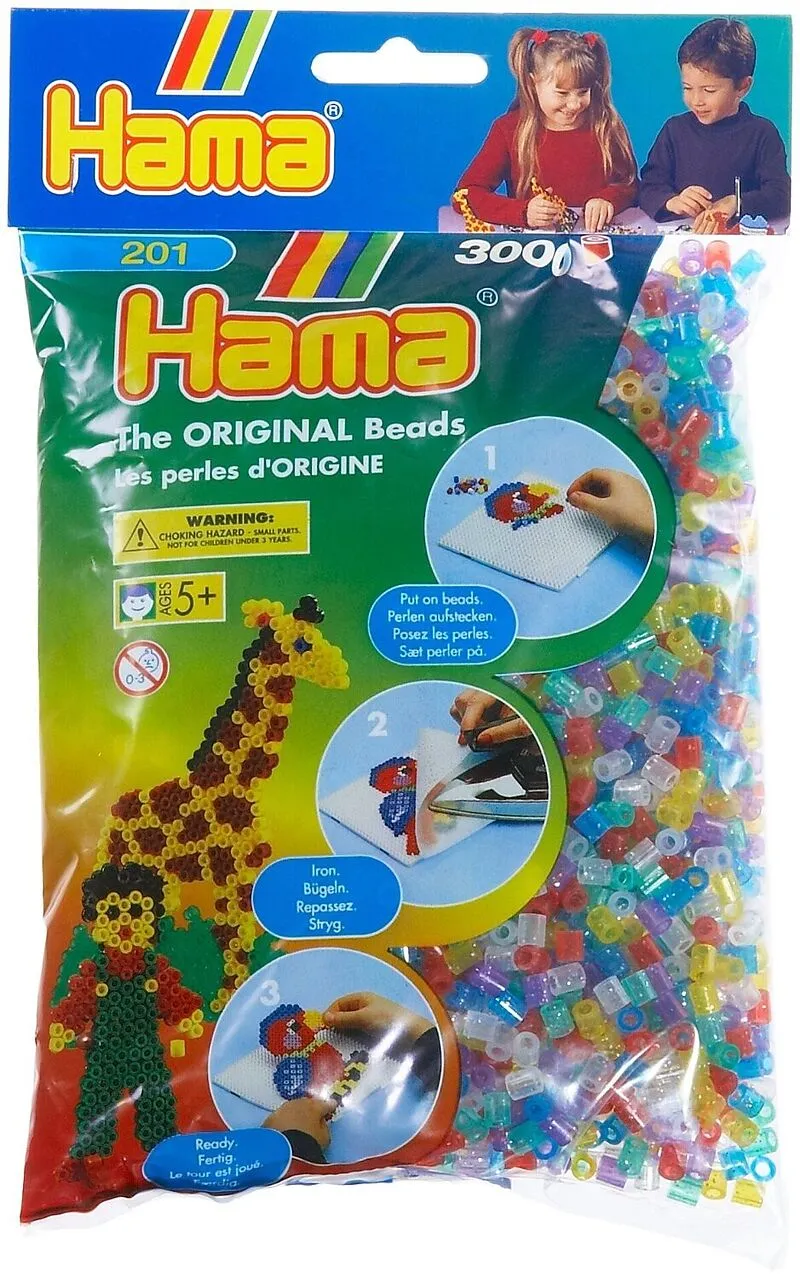 Beutel mit 3000 HAMA-Perlen im Glitter-Mix: 6 Farben (Glitterrot, Glittergelb, Glitterblau, Glittergrün, Glitterweiß, Glitterlila). Ab 5 Jahren.