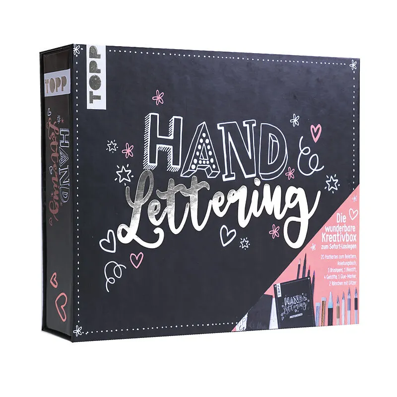 Handlettering - Die wunderbare Kreativbox Wertige Box ca. 23 cm x 17 cm x 4,5 cm, 3 Brush Pens mit biegsamer Spitze in 3 Farben (Blau, Beere, Schwarz), 1 Bleistift, 4 Gelschreiber (Schwarz, Weiß, Gold, Silber), 1 Glue-Marker, 2 Glitzerröhrchen (Silber und Gold...