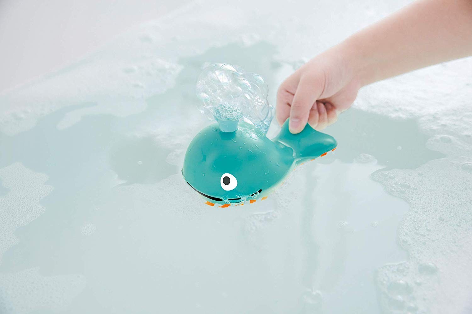 Dieser lustige Wal liebt Seifenblasen, die er ganz einfach selbst machen kann. Mit ihm kommt Blubberspaß in die Wanne! Den Wal mit Schaumbad oder Flüssigseife füllen und wiederholt unter die Wasseroberfläche drücken, um Seifenblasen zu erzeugen.
