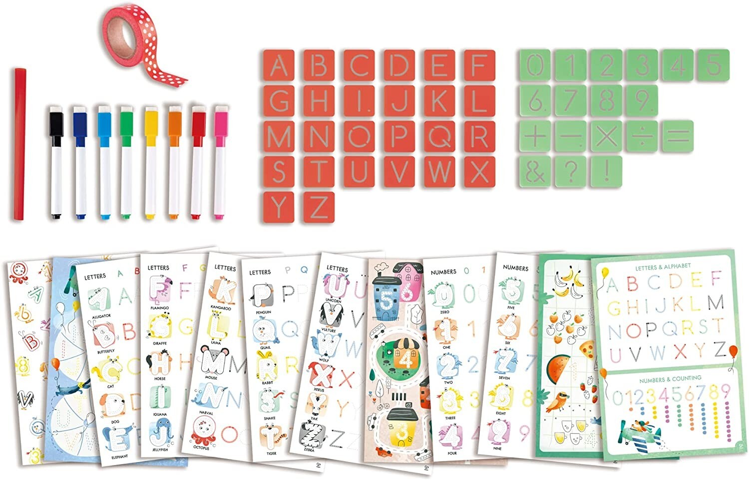 Übe das ABC und das Zählen, sowie das Schreiben von Wörtern und Zahlen mit diesem tollen Set. Das Set enthält Schablonen mit insgesamt 44 Buchstaben, Zahlen und Zeichen, acht Whiteboard-Marker mit Radiergummi, einen DIN A3 Aktivitäts-Zeichenblock und eine Klem...