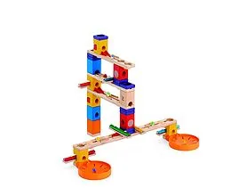 Music Motion bringt durch die Kombination der hölzernen Schienen und Klötze mit strategisch platzierten Klangplatten die klassischen Quadrilla -Kugelbahnen zum Klingen.
