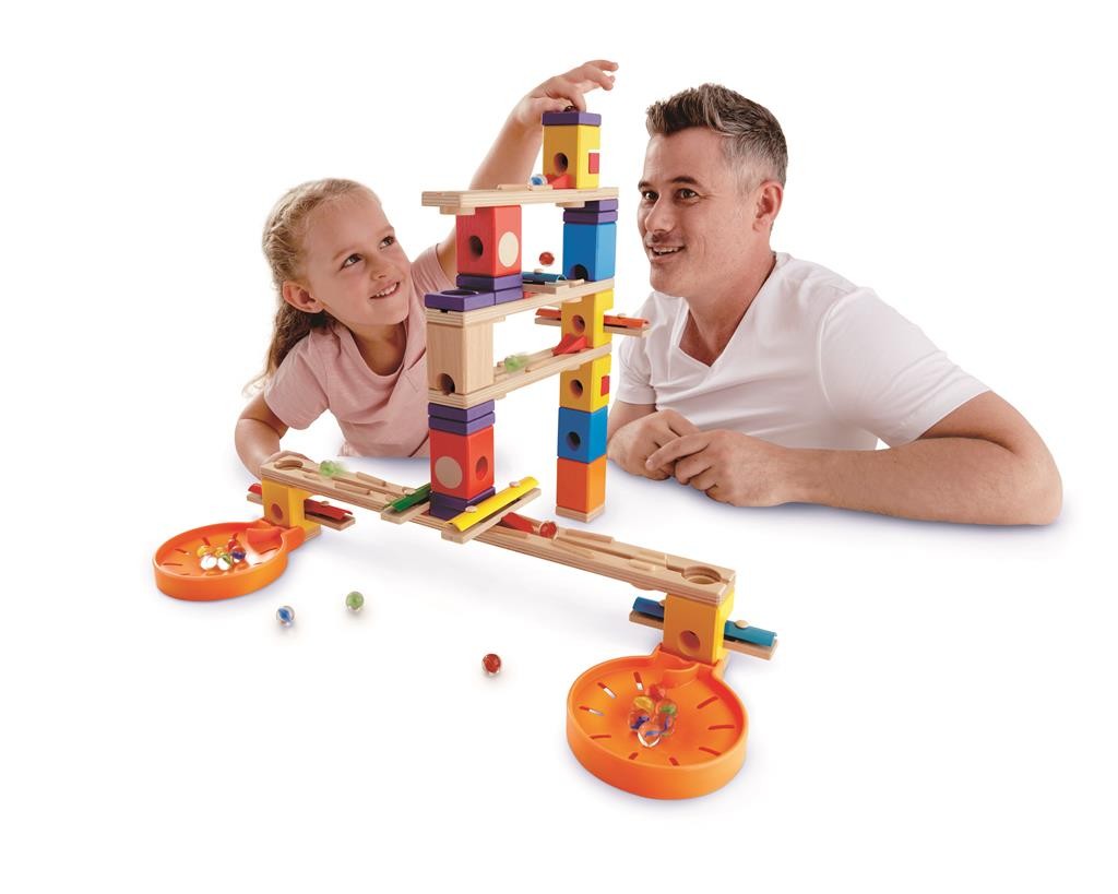 Music Motion bringt durch die Kombination der hölzernen Schienen und Klötze mit strategisch platzierten Klangplatten die klassischen Quadrilla -Kugelbahnen zum Klingen.