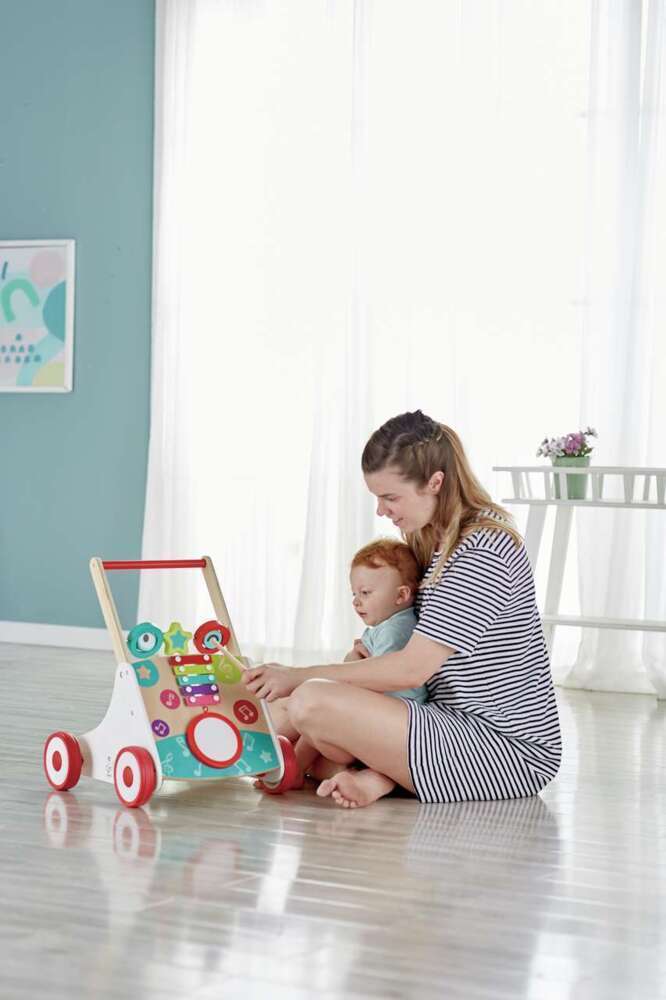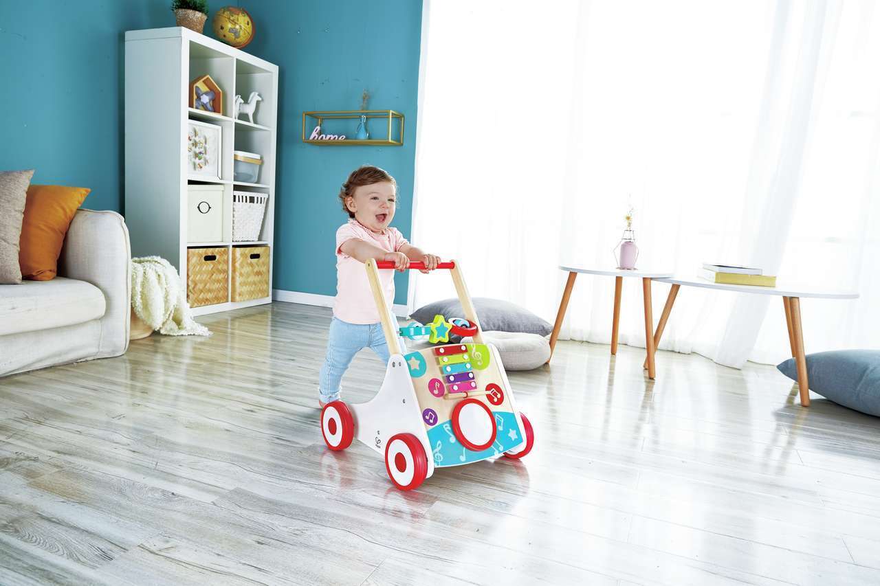 Mit dem Musik Laufernlernwagen flitzen alle los! Er kann auf das Lauftempos angepasst werden und verfügt unter anderem über eine Trommel und ein Xylophon.
