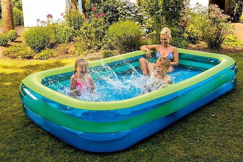 Jumbo-Pool, aufgeblasen ca.305x183x50 cm, unaufgeblasen ca. 288x165x40 cm 2 Ringe,1 Wasserauslassventil Jumbo-Pool