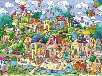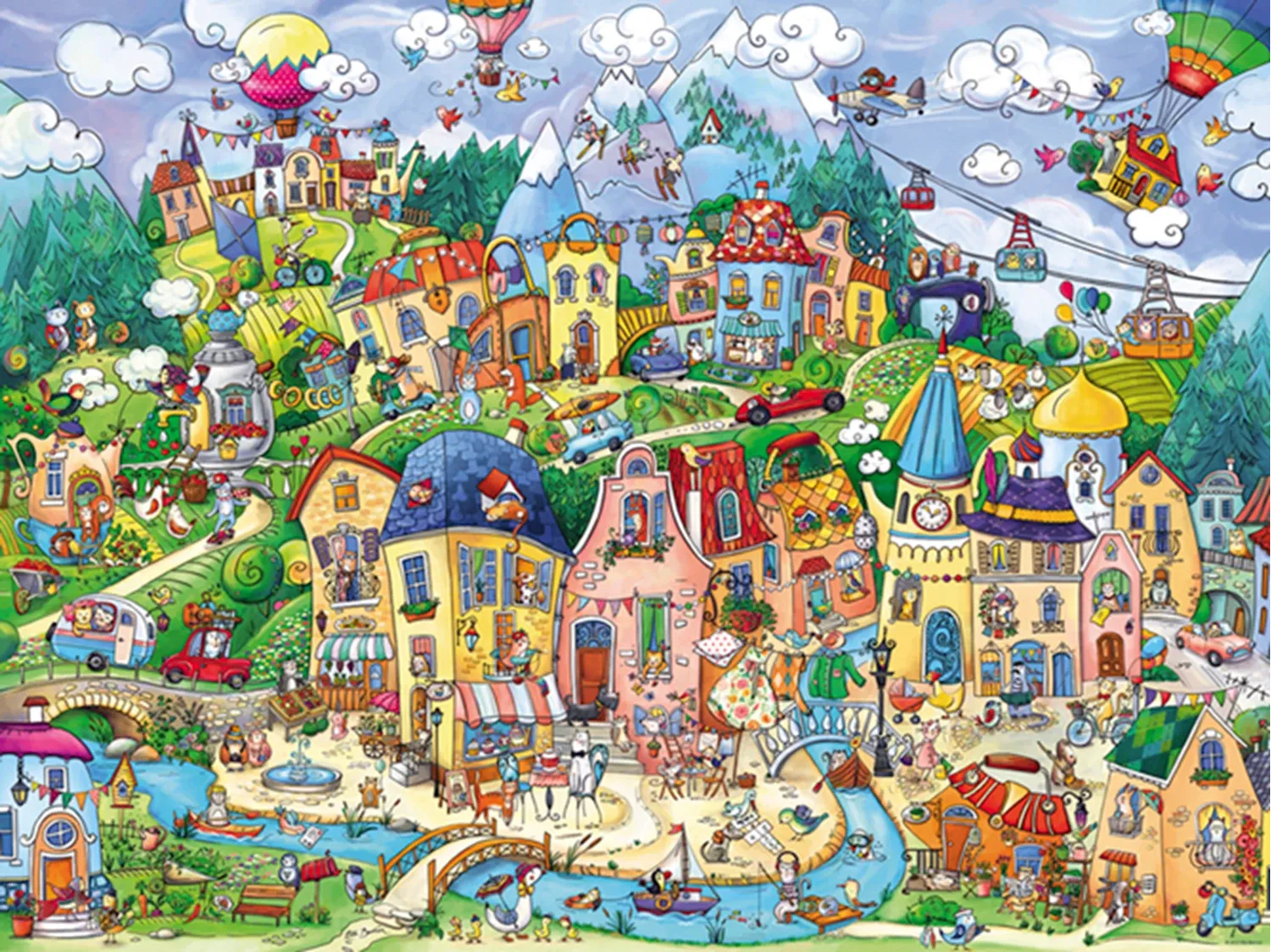 Ein Traumstädtchen, das Rita Berman da geschaffen hat! Niedliche Tierchen, schnucklige Häuslein, Hügelchen und Bächlein. Das Böse ist doch nicht immer und überall. Gelegte Grösse: 80x60 cm.