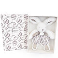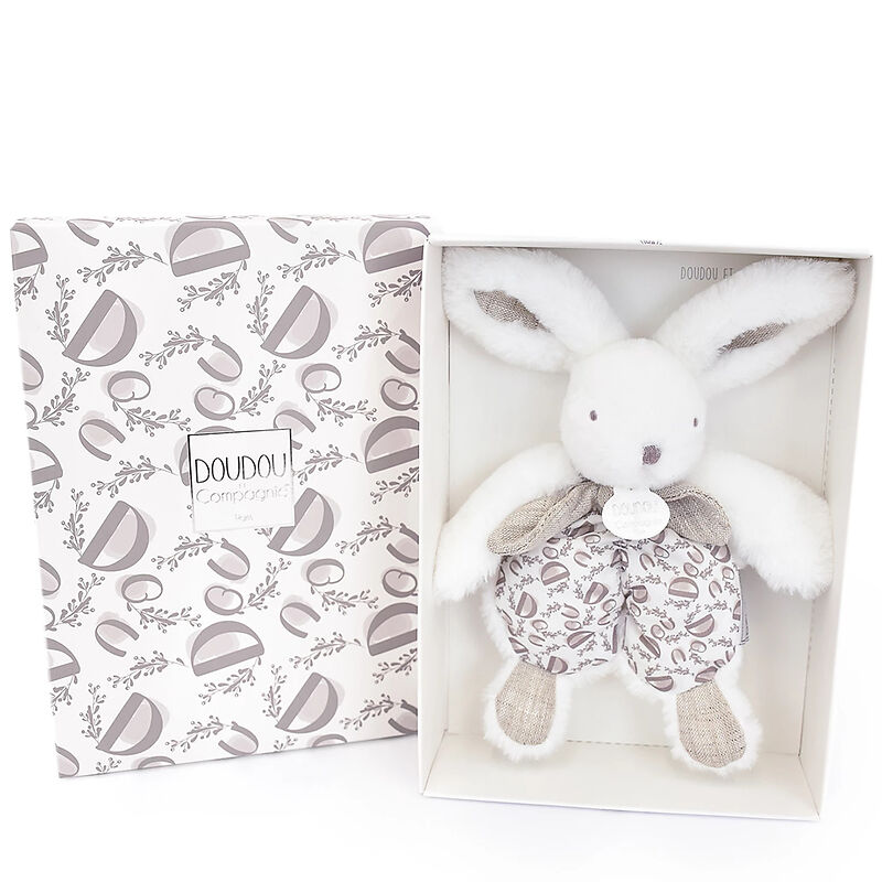 Der Hase in weiss mit Halstuch hat Arme zum Kuscheln und Pfoten, an deren Enden sich die Knötchen bewegen lassen sowie ein Pompon. Sein seidiges und langes Fell lädt zum kuscheln ein. Maschinenwäsche bei 30° Grad. Grösse: 18cm.