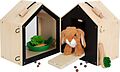 Eine Hasenhütte für das Plüsch-Langohr! Die Doppelhütte aus stabilem Holz, die auch als Transportkäfig genutzt werden kann, besteht aus zwei mit Kugeln und Schlingen zusammenknüpfbaren Häuschen: In dem einen Teil kann der Kuschelhase schlafen und ist durch ein...