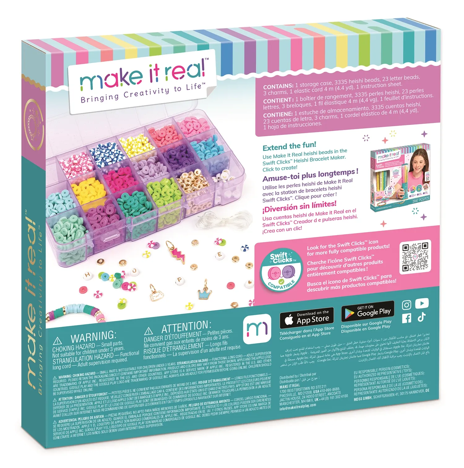 Das Heishi-Perlen Set umfasst über 3.300 gemusterte Perlen, zusätzliche Metallic-Varianten sowie drei neue Charms und wird in einer praktischen Aufbewahrungsbox geliefert. Alle Komponenten sind mit dem Swift Clicks™ Heishi Bracelet Maker kompatibel und e...