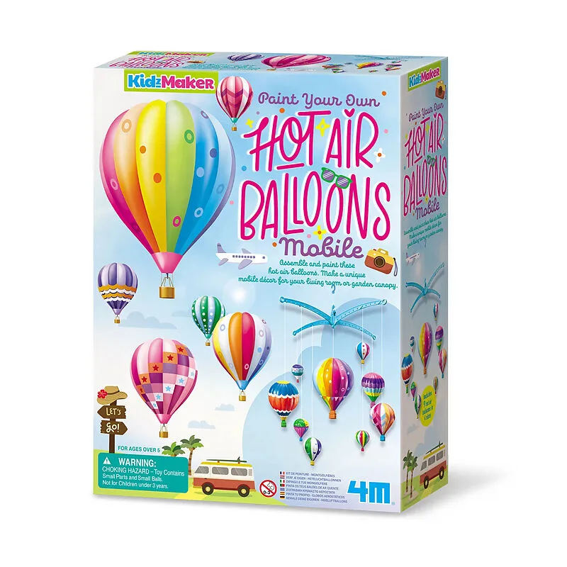 Bastel dein individuelles Heissluftballon-Mobile.Bemale die Ballons und decoriere sie wie es dir gefällt.