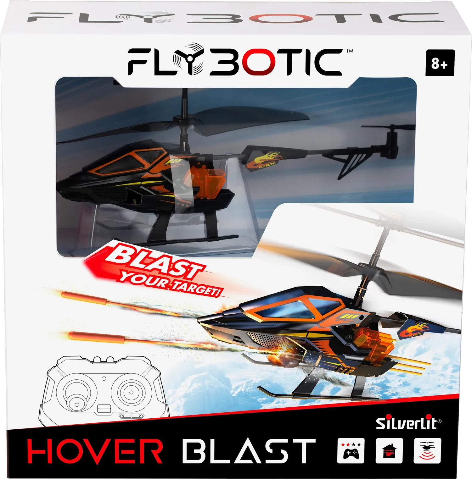 Der Hover Blast Helikopter schiesst Raketen im Einzel- oder Schnellfeuer-Modus ab, verfügt über eine Auto-Schwebefunktion und kann selber starten und landen. Inklusive 16 Raketen und eine Zielscheibe. Für den Einsatz in Innenräumen.