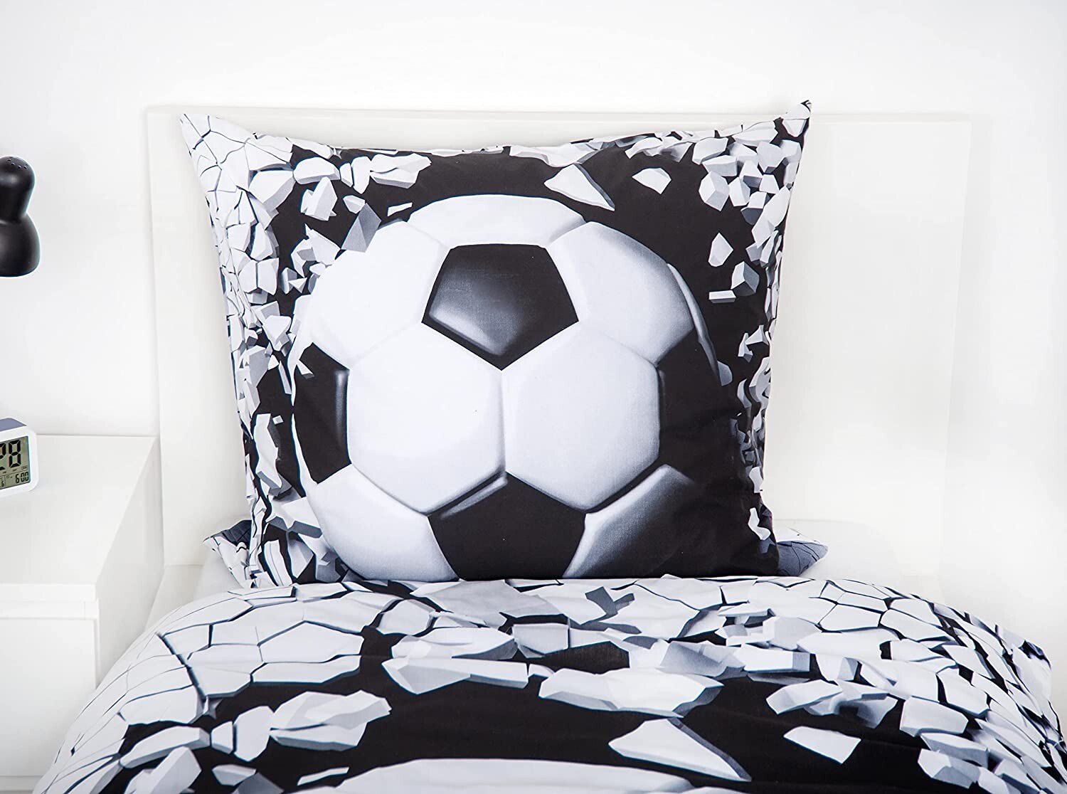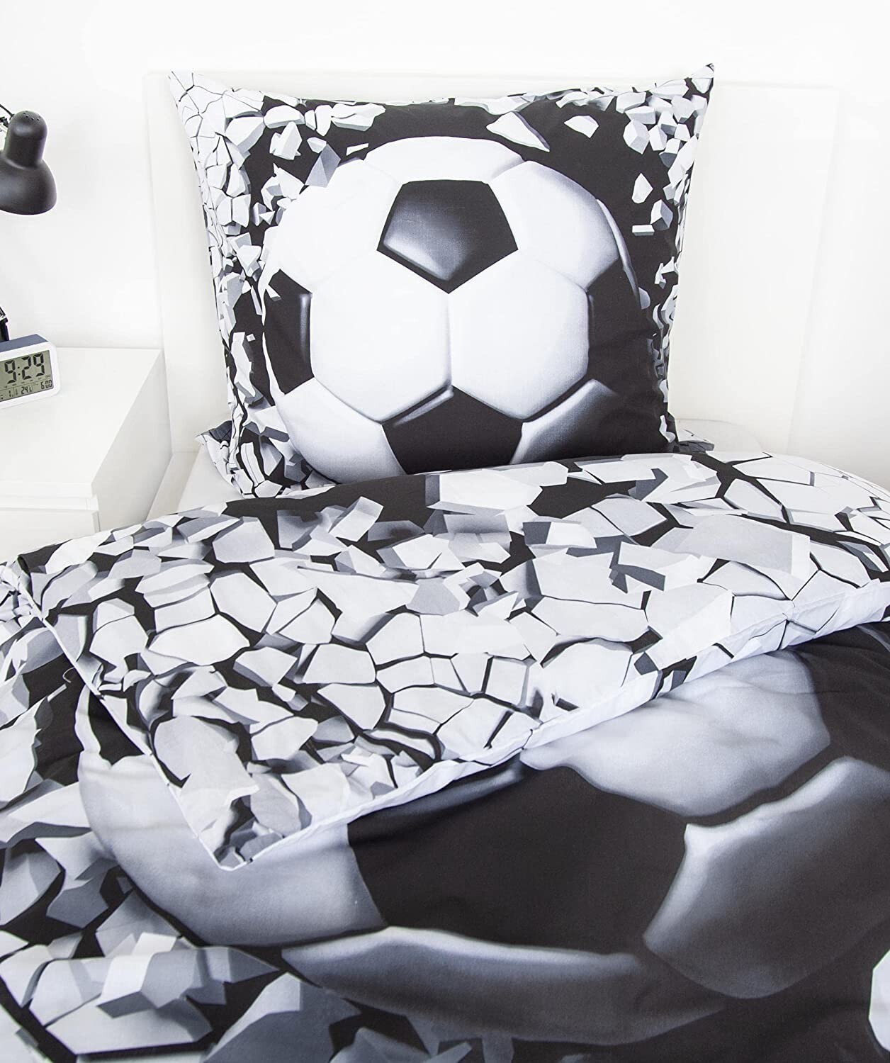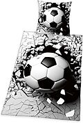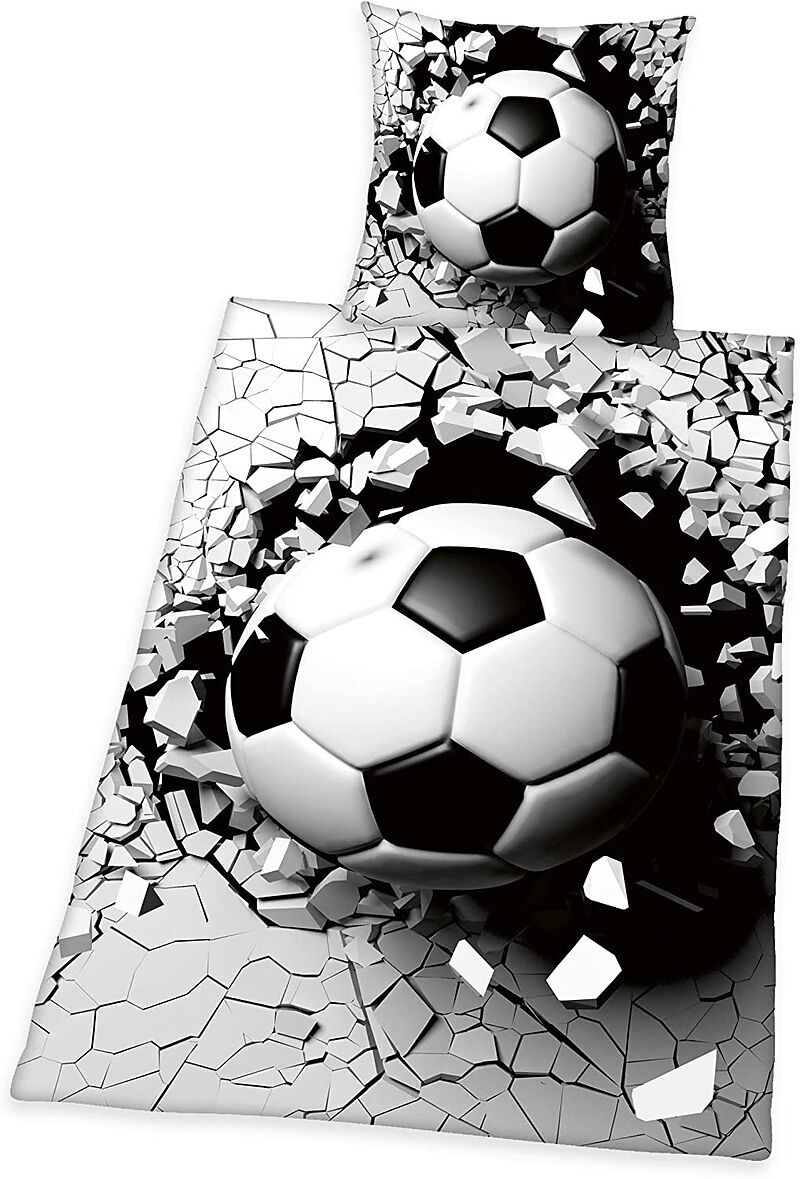 HERDING Young Collection 3D-Fußball Bettwäsche-Set Material: 100% Baumwolle, Renforc Zertifiziert: STANDARD 100 by OEKO TEX Größe: 80 x 80 cm + 135 x 200 cm Verschluss: Markenreißverschluss Pflegehinweise: Trocknergeeignet, Waschbar bis 60C Tolles 2-teiliges S...