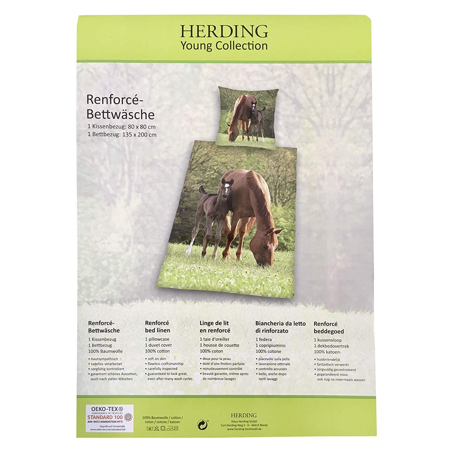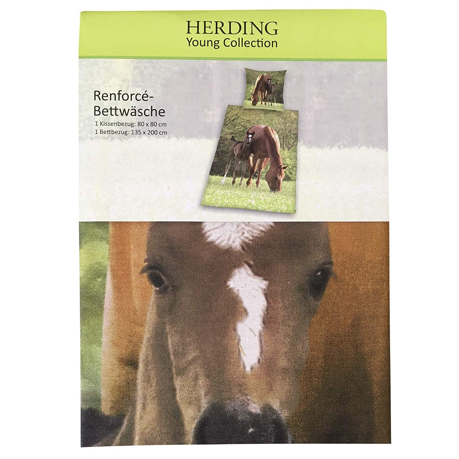 Tolle Fotodruck Bettwäsche aus der Young Collection mit wunderschönem Stute & Fohlen Motiv auf einer bunten Wiese. Material: 100 % Baumwolle. Größe: 135 x 200 cm bzw. 80 x 80 cm. Maschinenwaschbar bis 60 Grad und trocknergeeignet. Ein Muss für Pferde-Fans!