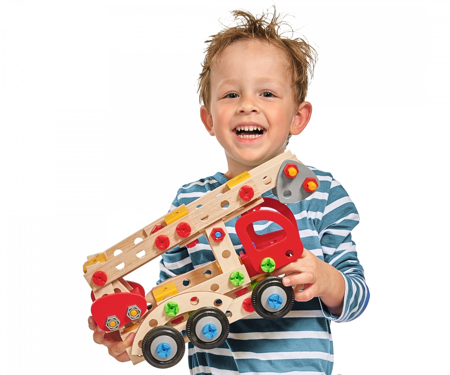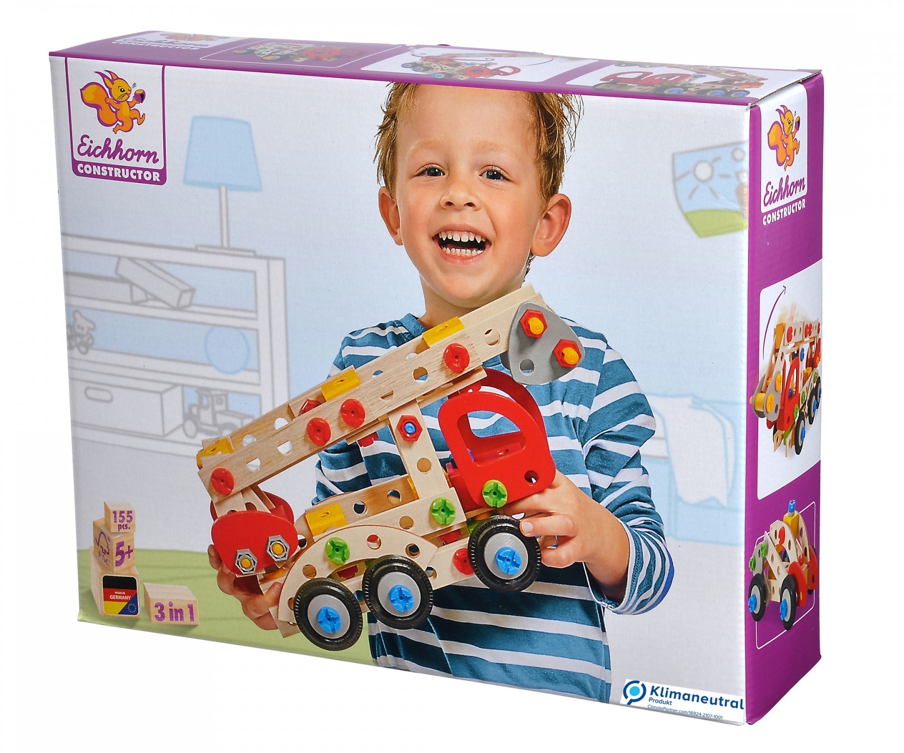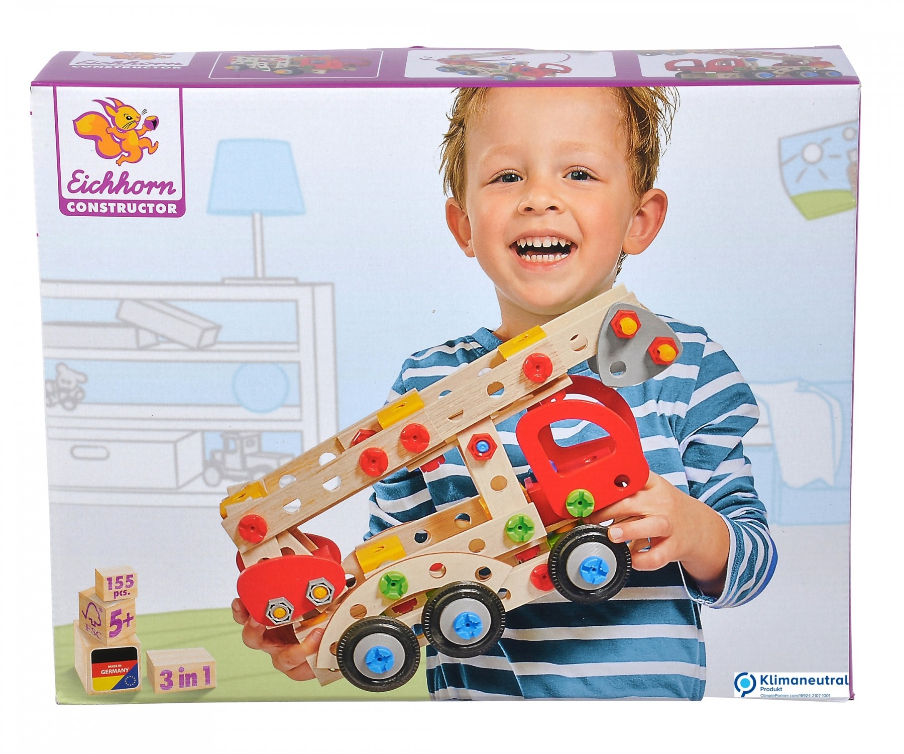 Eichhorn Constructor Feuerwehrauto: Baue dir aus dem 155-teiligen Eichhorn Constructor Set ein tolles Modell. Mit Hilfe der mitgelieferten Werkzeuge, der Anleitung und den Schrauben werden die 155 Holzteile und Verbindungselemente miteinander fixiert und das M...