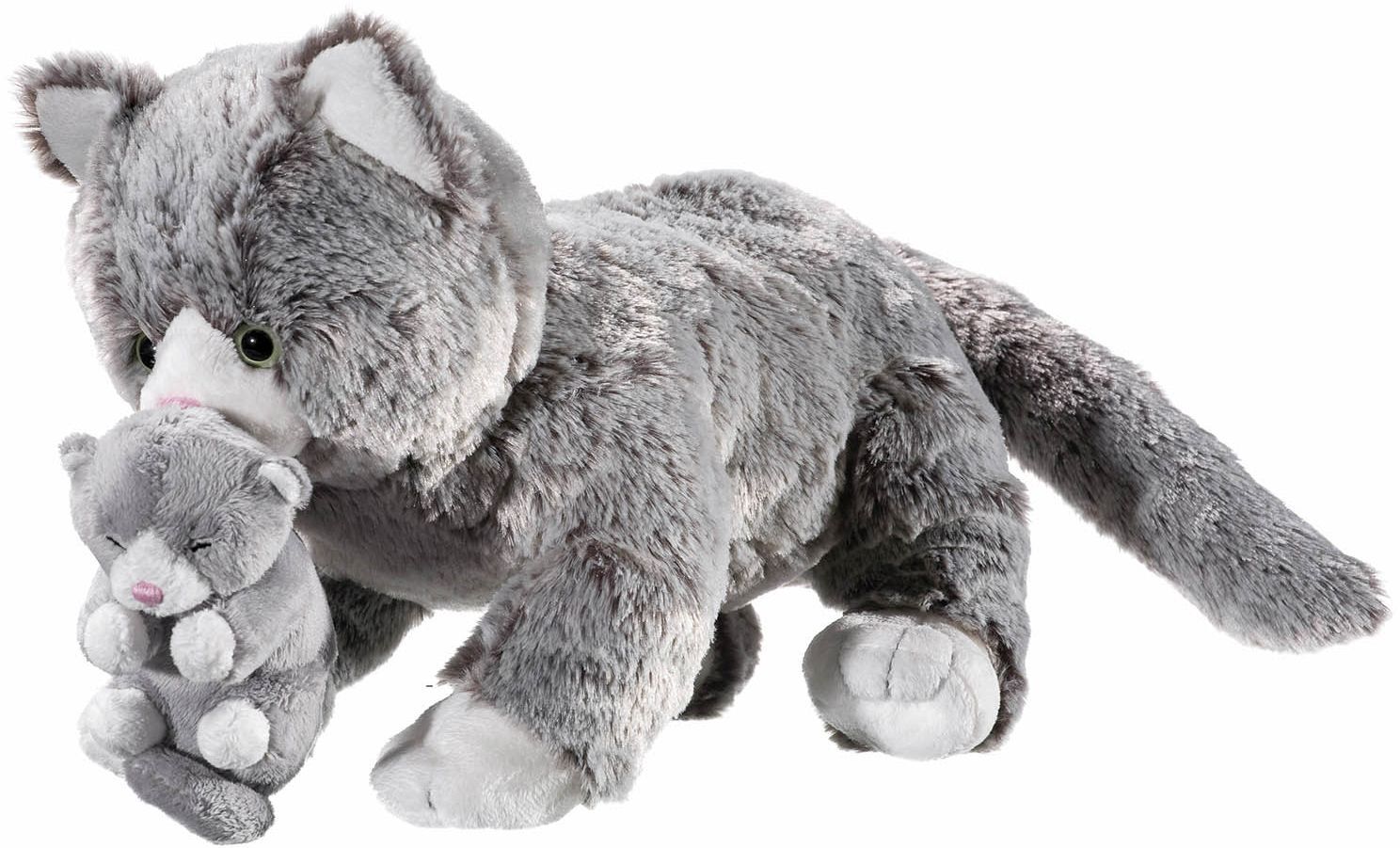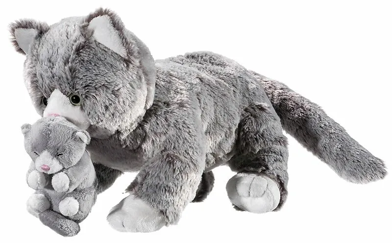 Schau nur, wie niedlich! Die Katzenmami trägt ihr kleines Katzenbaby herum und bringt es bestimmt in ihr gemeinsames Nest! Die Katze ist aus hochwertigem Softisisimo-Material gefertigt. Der kleine Nachwuchs ist fest vernäht, damit er nicht verloren geht. Größe...