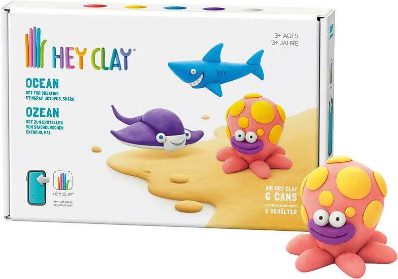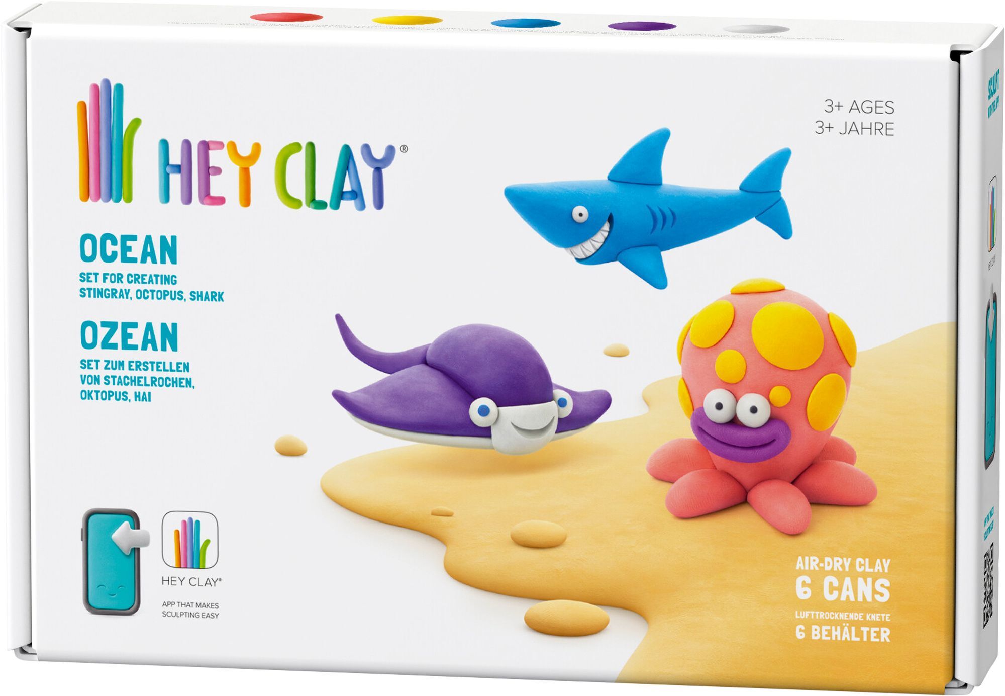 HEY CLAY Ozean 6 Dosen Set Lasse deiner Kreativität freien Lauf! Das mittlere Set mit 6 Dosen sorgt für endlosen Knetspaß! Es ermöglicht dir, alle 3 Figuren aus dem Themengebiet zu formen.Die Verpackung enthält ein Infosheet zum Freischalten der HEY CLAY App....