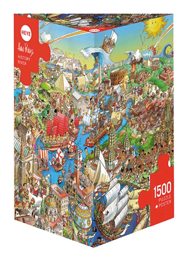 Hugo Prades lässt den Fluß der Zeit durch die ganze Geschichte fließen, angefangen vom Urknall, vorbei an wichtigen Bauwerken und Personen bis hin zur Gegenwart. Gelegte Größe: 60x80 cm.