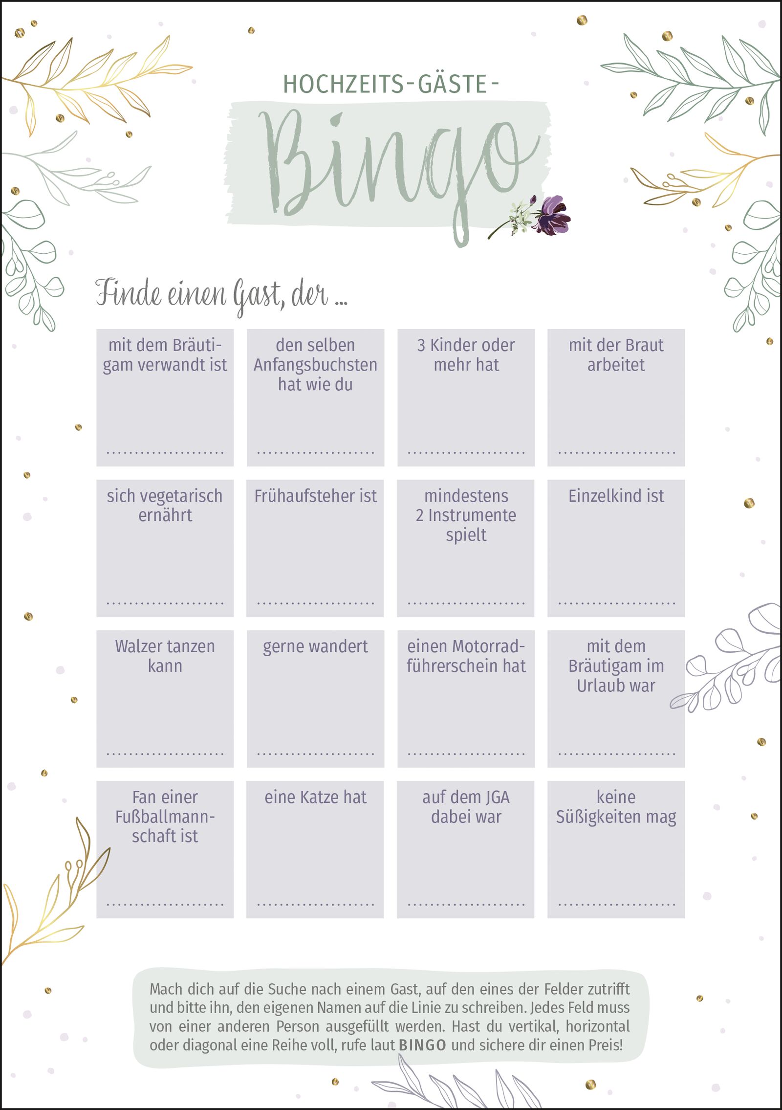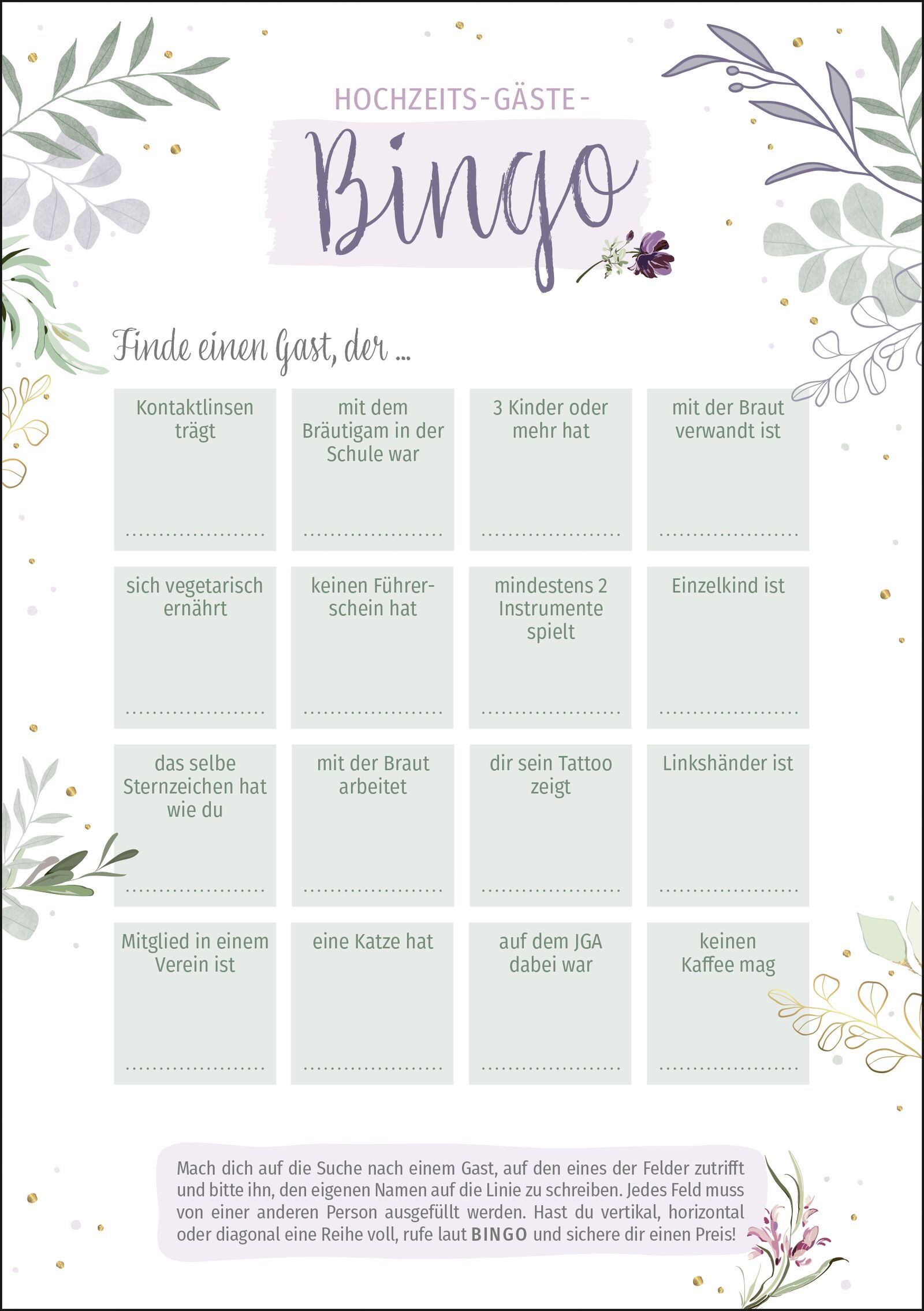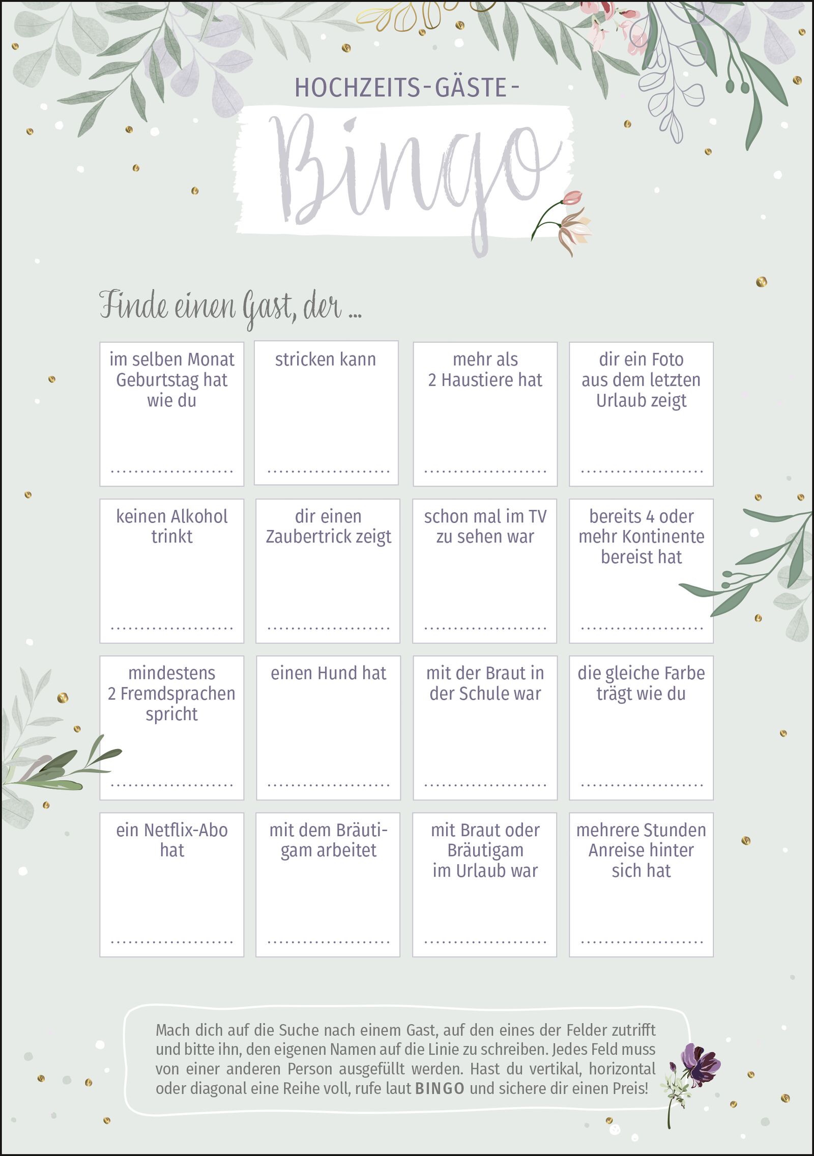 Das lustige Kennenlern-Spiel für die Hochzeitsfeier Dieses Spiel ist ein Muss für jede Hochzeits-Party! Es garantiert eine lebhafte Feier voller interessanter Gespräche und ganz viel Lachen - und das ganz ohne Vorbereitung! Wenn Brautpaare die Befürchtung hab...