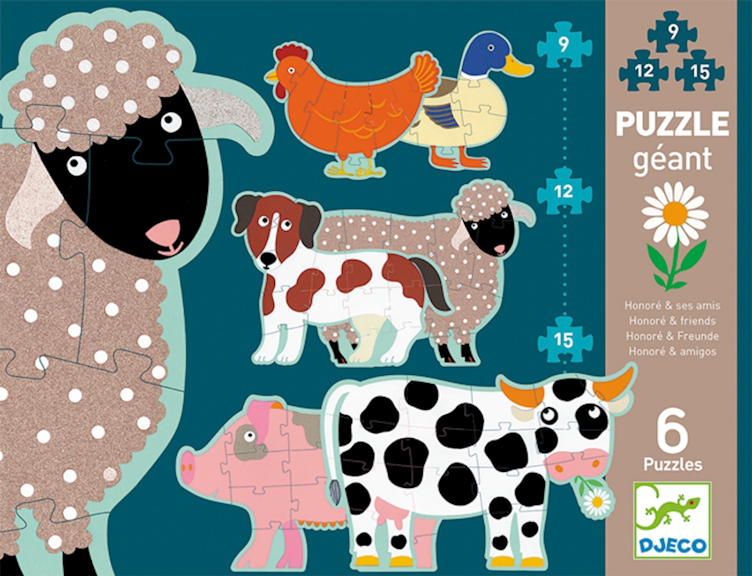 ab 3 Jahren 6 Puzzles 1.40m lang Diese Box enthält 6 süsse Tierpuzzles in unterschiedlichen Schwierigkeitsstufen von 9-15 Puzzleteilen pro Bild. Extragrosse Teile für kleine Kinderhände.