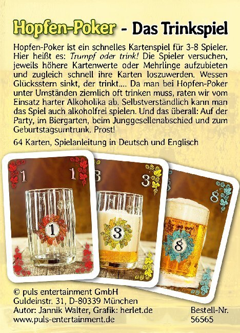 Hopfen-Poker ist ein Trinkspiel mit 68 Karten und eignet sich für 3-8 Spieler. Hier heißt es: Trumpf oder trink! Die Spielenden versuchen, jeweils höhere Kartenwerte oder Mehrlinge aufzubieten und zugleich schnell ihre Karten loszuwerden. Wessen Glücksstern si...