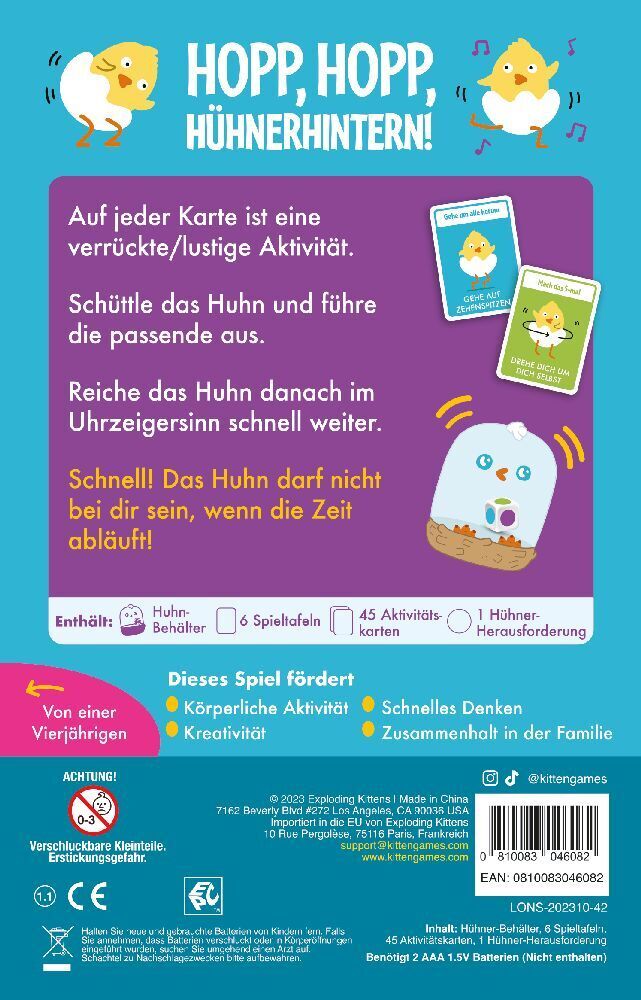 Asmodee Hopp, hopp, Hühnerhintern! Im verrückten Kinderspiel Hopp, hopp Hühnerhintern sitzt ihr alle im Kreis auf dem Boden und habt ein Nest vor euch, auf das das gackernde Huhn gesetzt werden kann. Auf jeder Karte ist eine andere verrückte und lustige Aktivi...