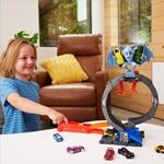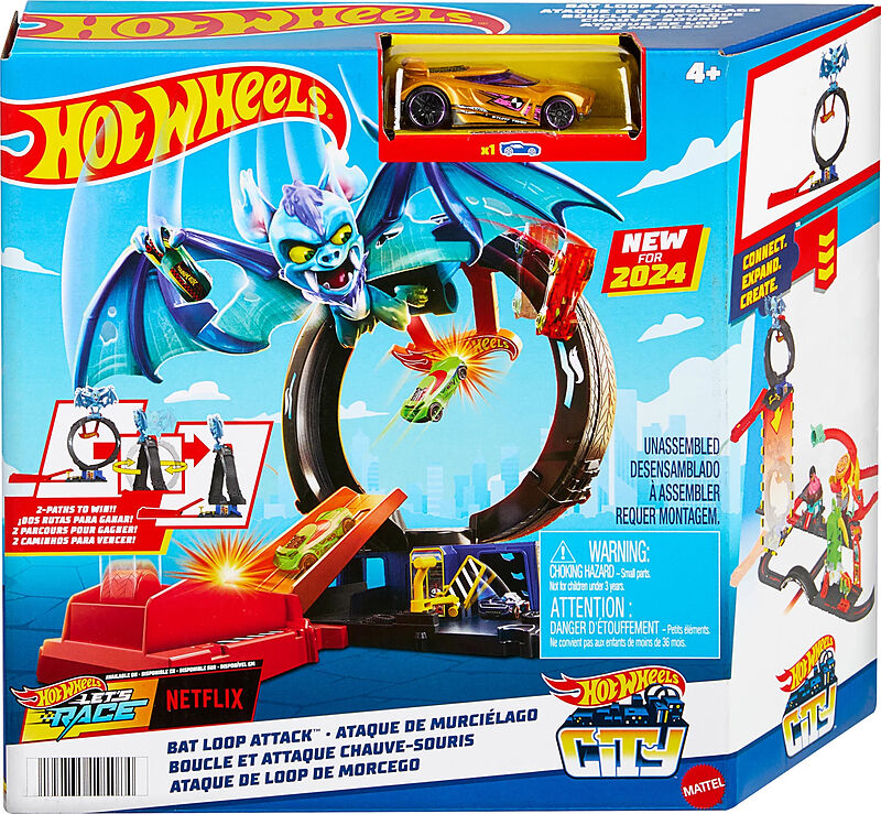 Rette die Stadt vor der riesigen Fledermaus, die sich auf den Looping gesetzt hat! Schiess mit Hilfe des Katapults Fahrzeuge auf die Fledermaus. Der Looping lässt sich drehen und ist eine tolle Rennpiste. Inklusive Fahrzeug Die-Cast.