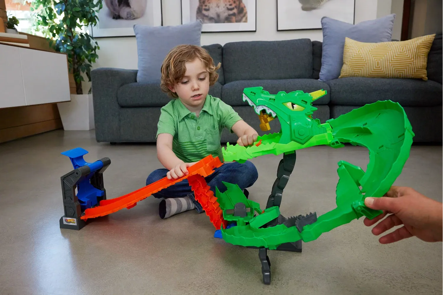 Hot Wheels Monster Trucks Sharks vs. Dinos Drachenzerstörungs-Spielset und 2 Spielzeugtrucks Die Hot Wheels Monster Trucks Great Bite und Rageasaur geben alles, um in diesem Sharks vs. Dinos Drachenzerstörungs-Spielset den Drachengegner zu besiegen. Einfach di...