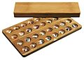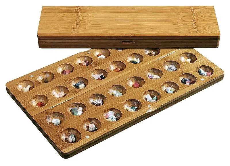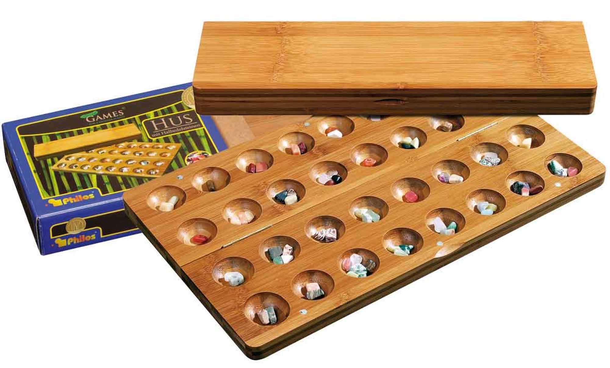 Kassette: Bambus, Magnetverschluss, klappbar, Natursteine in verschiedenen Größen und Farben, anspruchsvolle Kalaha Variante. Maße Spiel offen 475 x 280 x 20 mm.