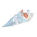 36cm große Babypuppe mit blauen Augen und weichem Körper. Kopf, Arme und Beine sind aus Vinyl. Trägt einen flauschigen beigefarbigen Strampler und Mütze. Inklusive hellblauer Wickeldecke, Schnuller und Schnullerkette.