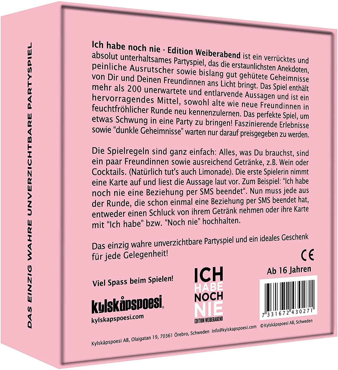 Ich habe noch nie Weiberabend Das einzig wahre unverzichtbare Partyspiel Ich habe noch nie ist ein verrücktes und absolut unterhaltsames Partyspiel, das die erstaunlichsten Anekdoten, peinliche Ausrutscher sowie bislang gut gehütete Geheimnisse von Dir und Dei...