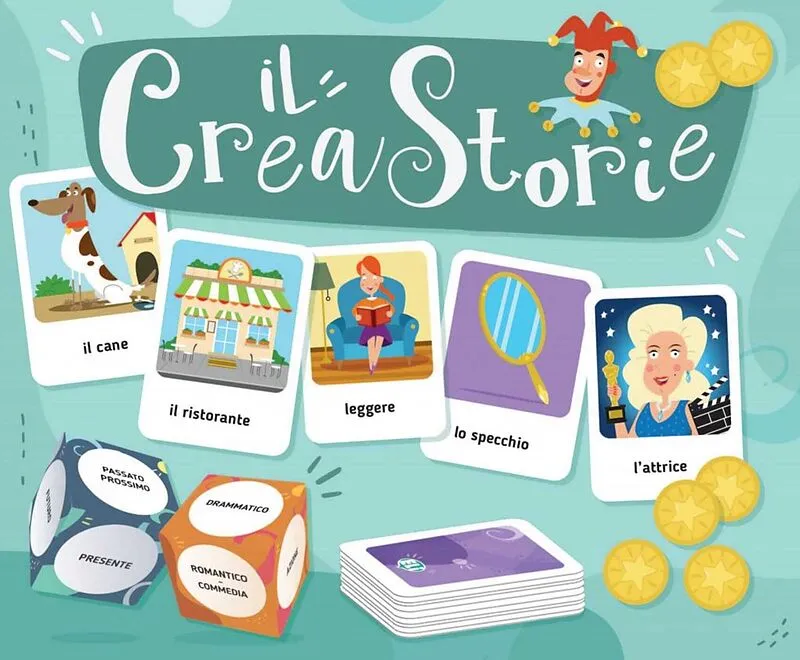 Präsentation Il CreaStorie ist ein lustiges Kartenspiel zum Formulieren von Sätzen und Erfinden von Geschichten mit illustrierten Sprachelementen. Die Figuren, Tiere, Orte, Objekte und Aktionen wurden so gewählt, dass eine große Anzahl von Kombinationen mögli...