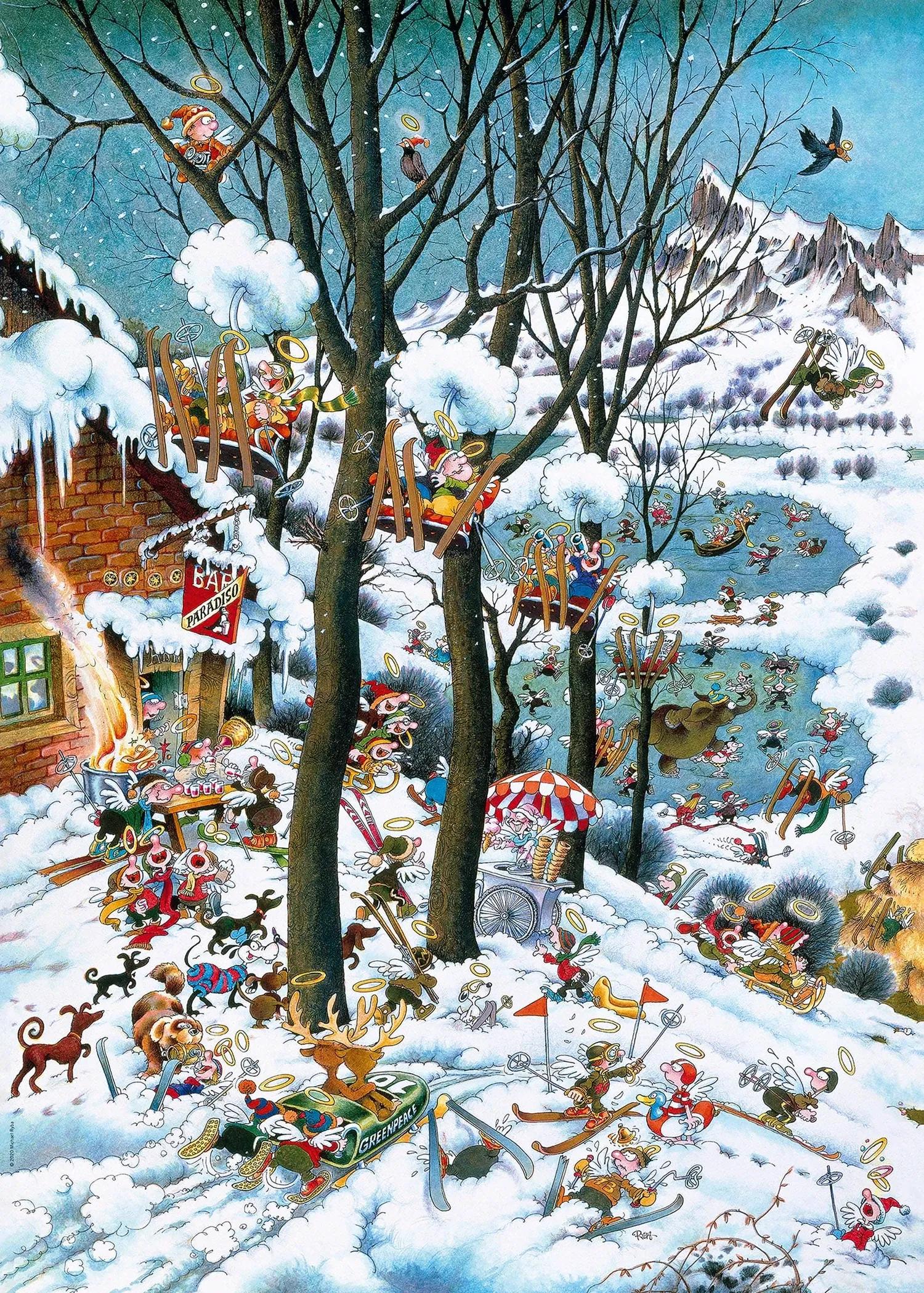 Ein actiongeladener Wintertag im Paradise von Ryba! Wer wissen will, wie es im Sommer so zugeht, legt rechts einfach das zweite Puzzle der Mini-Serie dran! Gelegte Größe: 50x70 cm.