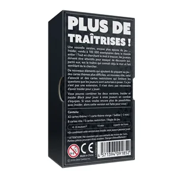 Une nouvelle version, encore plus épicée du jeu Insider, vendu à 100 000 exemplaires dans le monde ! Tout en cherchant le mot à trouver, les joueurs doivent être attentifs pour essayer de découvrir qui, parmi eux, est le traitre qui connait déjà le mot et fait...